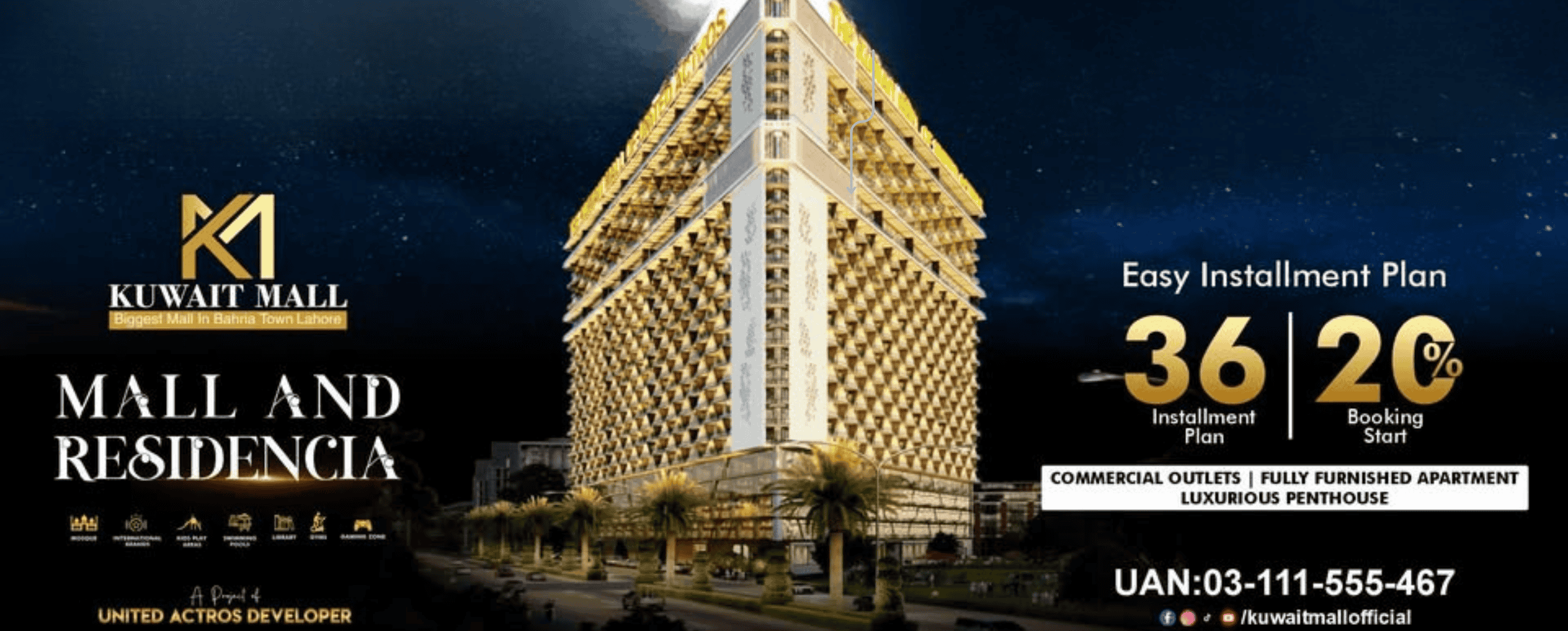 Kuwait Mall Bahria Town Lahore stands as a beacon of luxury and convenience in the heart of Bahria Town Lahore. Boasting the largest mall space in the area, Kuwait Mall offers a blend of upscale living, shopping, and commercial opportunities. This architectural marvel is designed to redefine urban lifestyle experiences, offering residents and visitors alike a one-stop destination for all their needs.